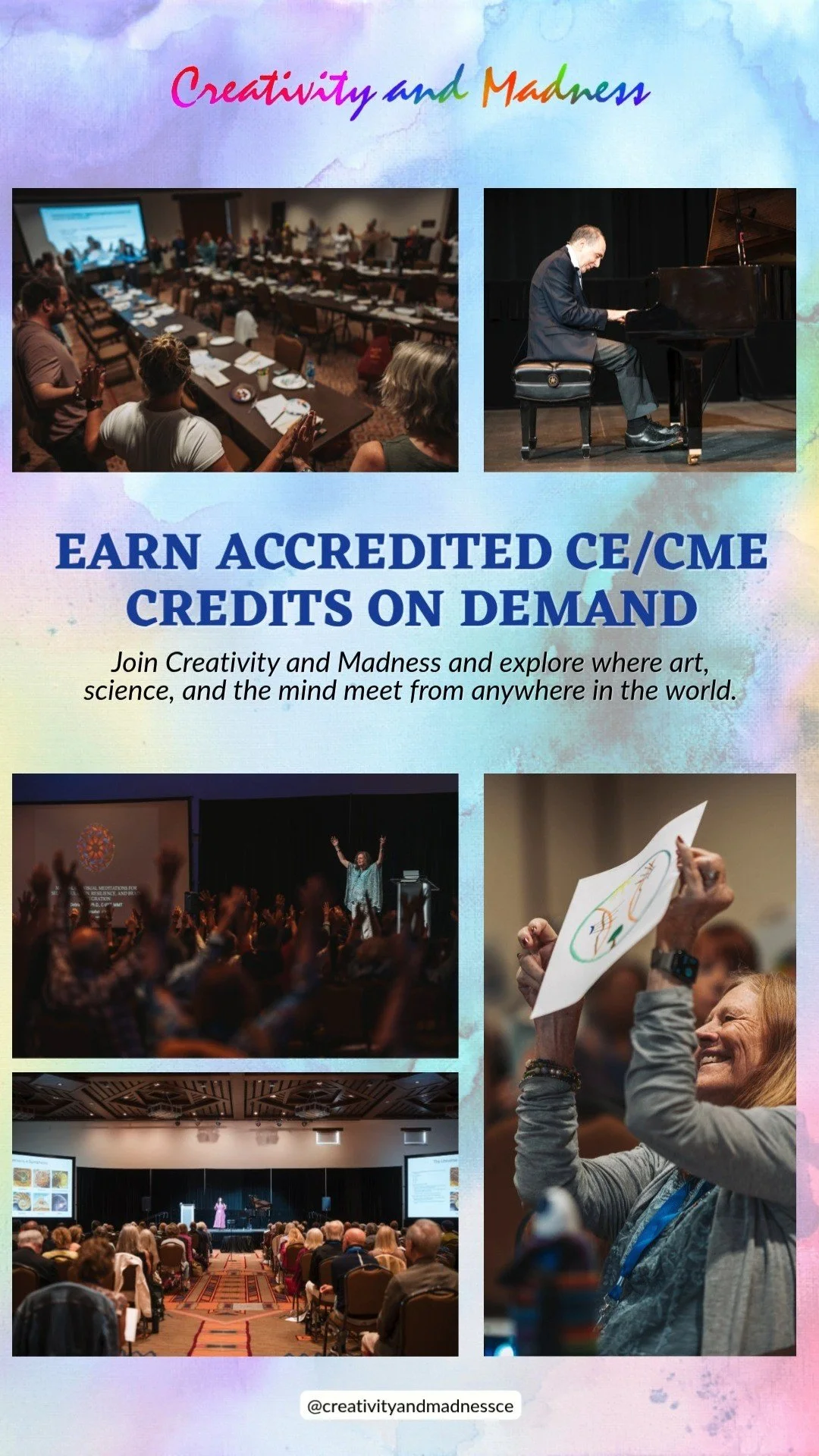 Unlike conventional CE/CME events, Creativity and Madness is a refreshing departure from the ordinary. It is a celebration of the powerful healing force of creativity, providing a dynamic space for professionals seeking more than textbooks and lectures. Our conferences delve into the intersection of psychology, the arts, and personal transformation, fostering a deeper understanding of how creative expression influences well-being.